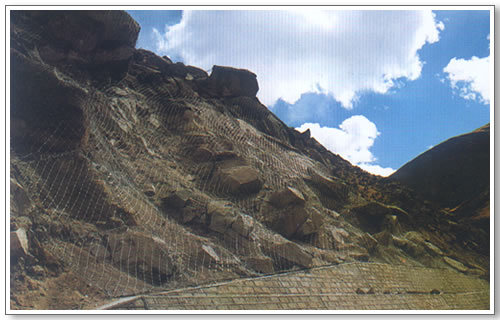 积极安全防护是勾花网紧靠公路边坡,将疏松的大石头压在公路边坡上,不许石块坠落这类方法运用于悬崖峭壁安全防护