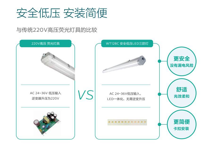 WT128C低压三防支架灯均匀和宽光束或蛋白石光分布,更长的滑块,更快的锁打开,无需工具的电气连接,便于灵活安装