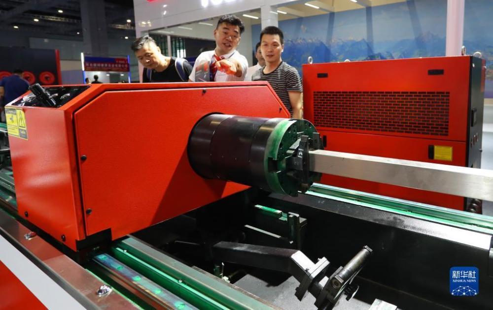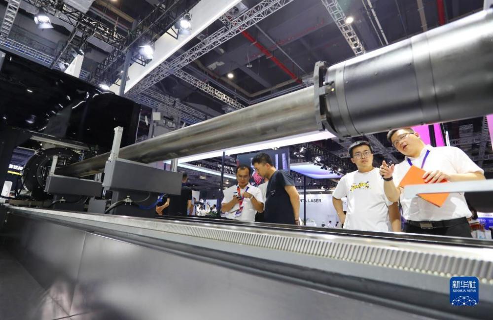 7月5日,参观者在一台光纤激光切管机旁与工作人员交流讨论。