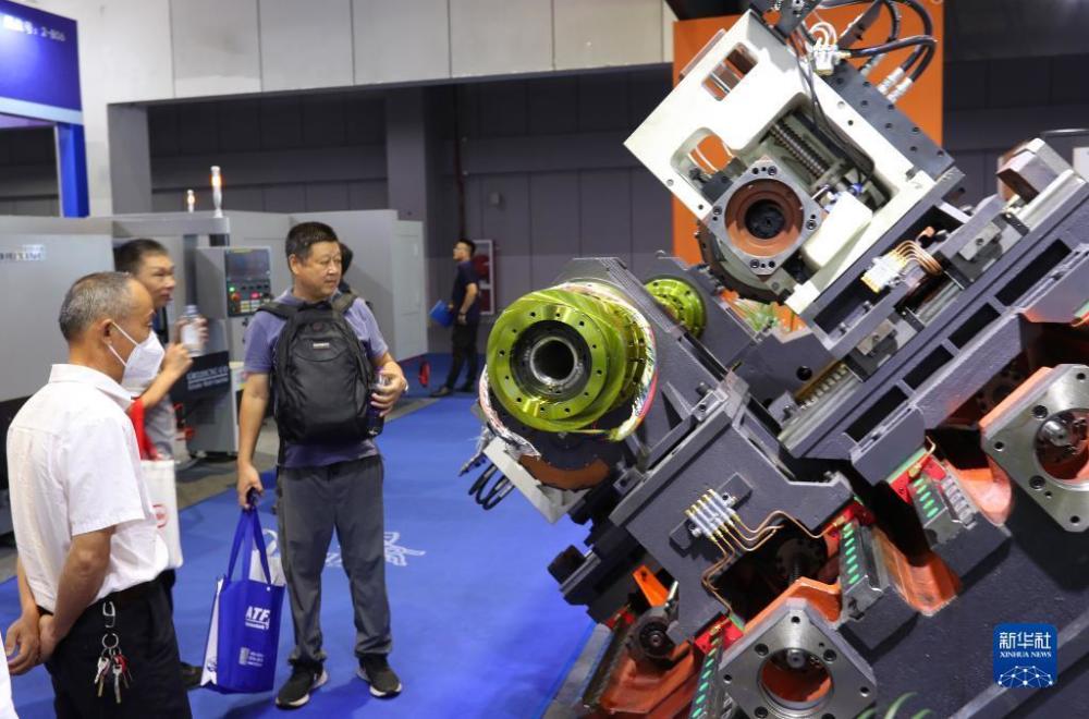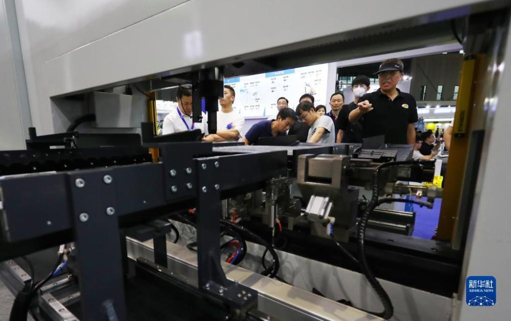 7月5日,参观者在一台进行模拟作业演示的机床前驻足观看。