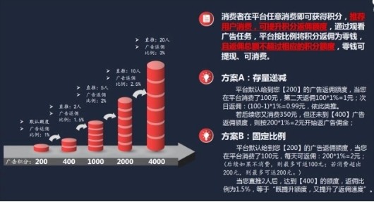 消费者在平台任意消费即可获得积分,通过观看广告任务,平台根据消费者剩余积分按比例返佣为零钱,零钱可提现、可消费。