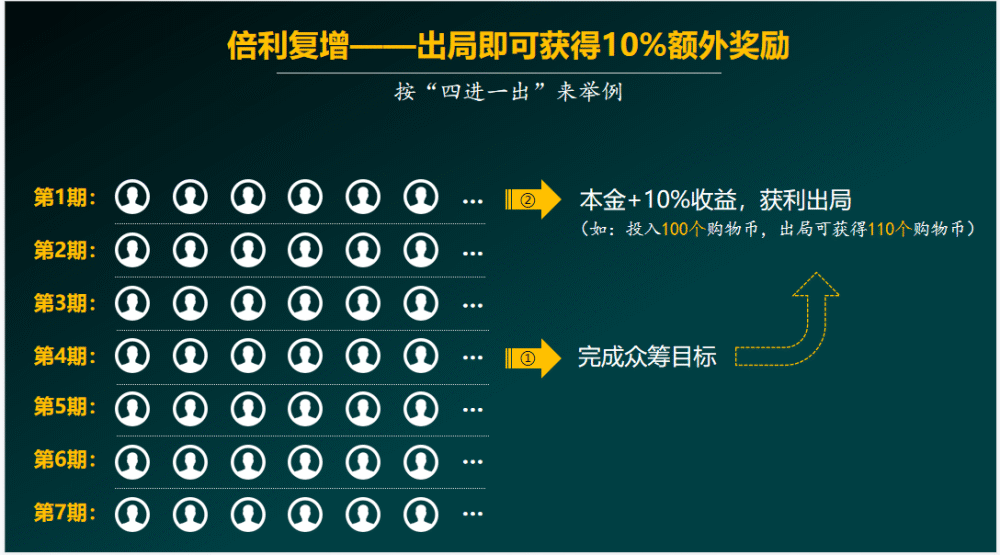 当第4期众筹完成的时候,第1期参与的用户可获得【本金+收益】,假设当初投入100个购物币,这时可以获得额外10%的奖励,*终有110个购物币(平台可以自行设置是否能提现)。以此类推,第5期完成的时候,第2期的用户可出局……这样“有进有出”,并且有时间差,大账吃小账,有利于平台的资金流稳定。