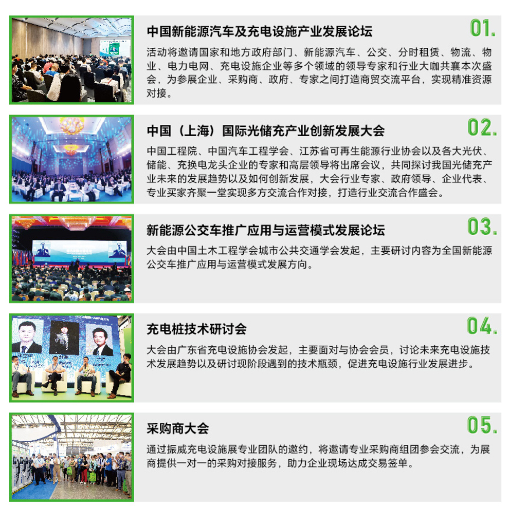 展会同期将举办“2023上海新能源汽车及充电设施产业发展论坛”、“金桩奖2023年度充电设施十颁奖盛典”、“新能源公交车推广应用与运营模式发展论坛”等多个主题活动。本次活动将邀请国家和地方、新能源汽车、公交、分时租赁、物流、物业、电力电网、充电设施企业等多个领域的领导专家和行业大咖共襄本次盛会,共同探讨新能源在全国各地的热点痛点,把脉十四五期间行业发展新趋势,通过参展企业、采购商、政府、专家之间的零距离交流,助力政企民交流合作,实现资源对接。