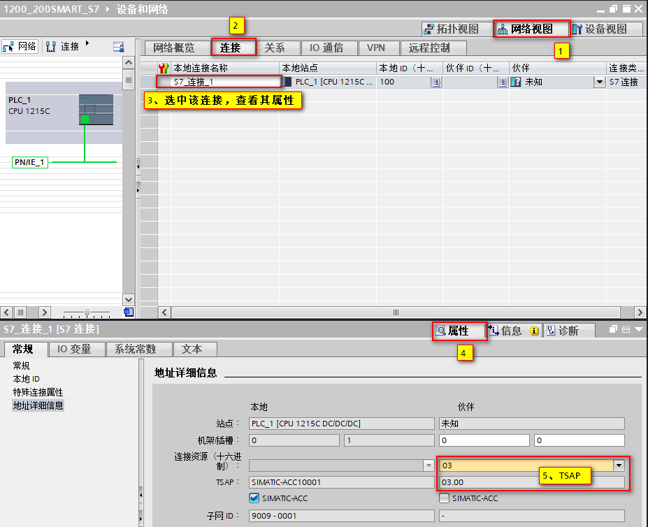 指令块组态完毕后,打开“网络视图”---“连接”选项卡,可以看到 TIA 自动创建的连接,打开该连接属性后,可以为连接设置 TSAP,默认值为03.00;S7-200 SMART 侧的 TSAP 只能设置为 03.00 或 03.01,如图 5 所示。