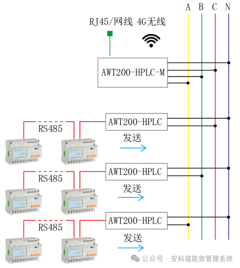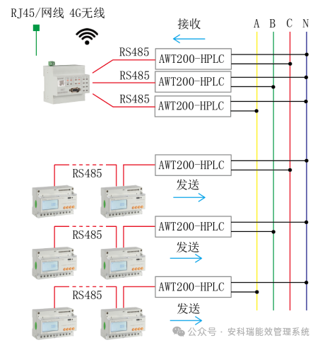 8载波通讯模块AWT200-HPLC 电力线载波通讯模块利用电力线作为数据传输媒介实现数据传输的网关。模块配有RS485通讯接口,用户使用时需要至少两个模块,将需要采集或下发数据的设备通过RS485接口连接其中一个模块,再将两个模块并入同一电力线,就可以使用另一模块的RS485接口采集或下发数据给自己的设备。实现RS485通讯和载波通讯之间的转换。 适用于对数据实时性要求不高的系统,数据刷新速度大于1分钟,比如Acrel-5000能耗管理系统 目前国内测试,国外暂不推广