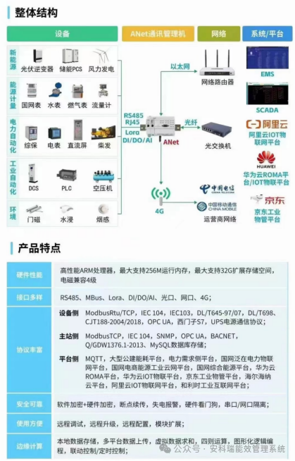 嵌入式linux系统,提供AES加密及MD5身份认证等安全需求,支持断点续传。北向支持1-2路以太网上传,南向支持2-16路RS485接口。 北向:支持ModbusTCP、IEC60870-5-104、各地区建筑能耗、电力需求侧协议、华云104协议、SNMP、MQTT、OPC UA、IEC61850、Q/GDW376.1等 南向:MODBUS-RTU、DLT645-1997&2007协议、IEC60870-5-101/103、DL/T698、CJ/T188协议等 适用公司所有系统,其中海外包括: AcrelEMS企业微电网能效管理系统 Acrel-2000电力监控系统(仅东南亚) Acrel-3000电能管理系统 Acrel-5000能耗管理系统 Acrel-7000企业能源管控系统(仅东南亚) Acrel-8000数据中心能效管理系统 AcrelCloud-1000变电所运维平台 AcrelCloud-3200预付费系统