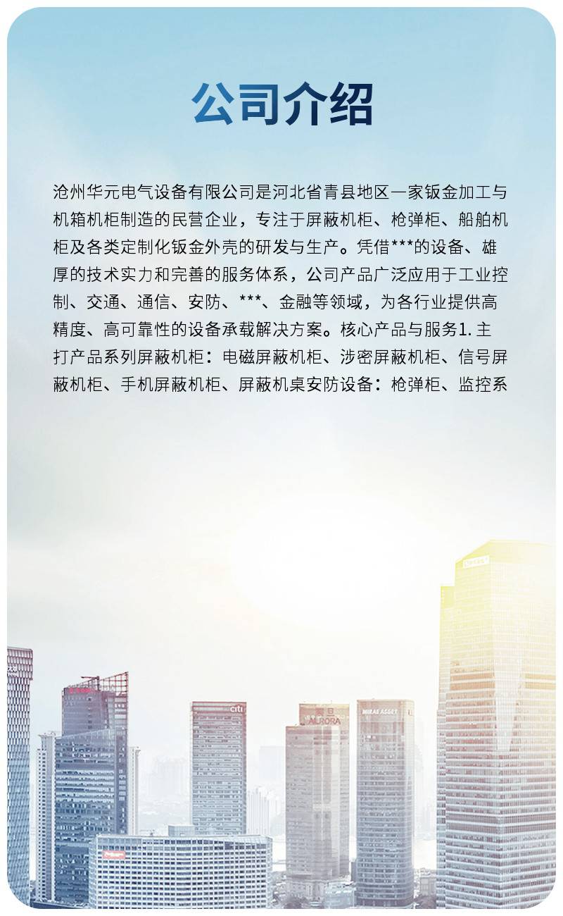 沧州华元电气设备有限公司是河北省青县地区一家钣金加工与机箱机柜制造的民营企业,专注于屏蔽机柜、枪弹柜、船舶机柜及各类定制化钣金外壳的研发与生产。凭借先进的设备、雄厚的技术实力和完善的服务体系,公司产品广泛应用于工业控制、交通、通信、安防、国防、金融等领域,为各行业提供高精度、高可靠性的设备承载解决方案。
