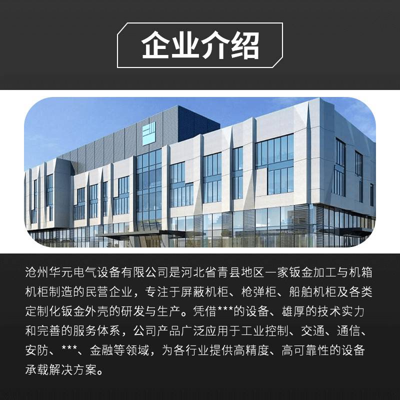 沧州华元电气设备有限公司是河北省青县地区一家钣金加工与机箱机柜制造的民营企业,专注于屏蔽机柜、枪弹柜、船舶机柜及各类定制化钣金外壳的研发与生产。凭借先进的设备、雄厚的技术实力和完善的服务体系,公司产品广泛应用于工业控制、交通、通信、安防、国防、金融等领域,为各行业提供高精度、高可靠性的设备承载解决方案。