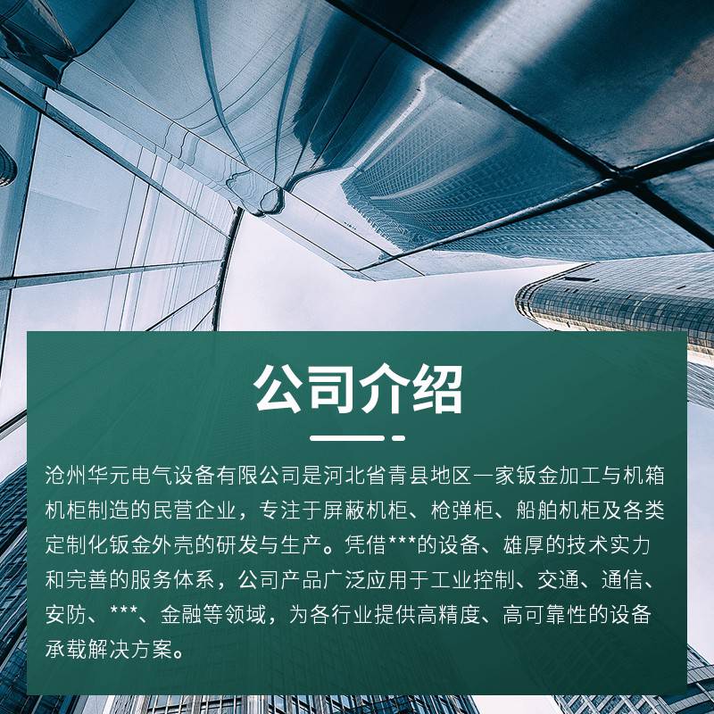 沧州华元电气设备有限公司是河北省青县地区一家钣金加工与机箱机柜制造的民营企业,专注于屏蔽机柜、枪弹柜、船舶机柜及各类定制化钣金外壳的研发与生产。凭借先进的设备、雄厚的技术实力和完善的服务体系,公司产品广泛应用于工业控制、交通、通信、安防、国防、金融等领域,为各行业提供高精度、高可靠性的设备承载解决方案。