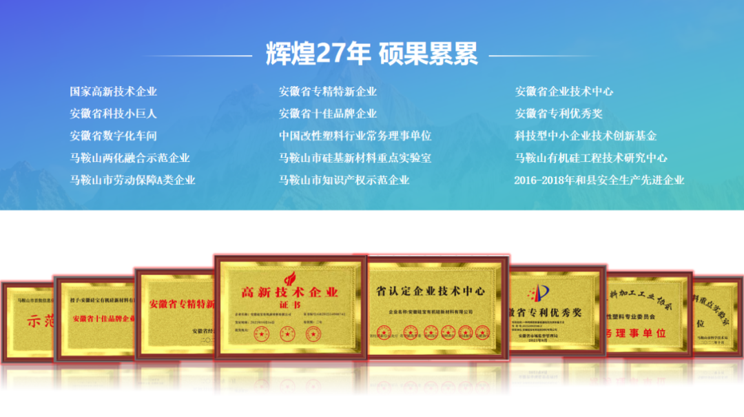 公司仲胺基硅烷偶联剂等20项产品被认定为“安徽省高新技术产品”,光伏行业专用硅烷偶联剂产品通过了“安徽省首批次新材料”认定。公司获得Reach注册认证产品7项,RoHS认证产品8 项,K-Reach注册认证产品9项,同时还获得了国家科技部技术创新基金的支持。 2011年公司获得了中国化工行业协会颁发“中国改性塑料行业十佳企业”荣誉称号, 2012年公司被评为马鞍山首批两化融合示范企业,2023年获得“安徽省消费品工业 ‘三品’示范企业”、“马鞍山市重点实验室”和“省级企业技术中心”荣誉称号,并通过光伏行业专用硅烷偶联剂产品通过了“安徽省首批次新材料”认定。 2015年获得“技术进步奖三等奖”两项。2016至2018年连续三年获得“安全生产先进企业”荣誉称号。2019年获得“马鞍山市专精特新企业”荣誉称号,2020年获得“安徽省专精特新企业”荣誉称号。2023年获得“安徽省消费品工业三品示范企业”、“马鞍山市重点实验室”和“省级企业技术中心”荣誉称号。公司已通过 ISO9001质量管理体系、ISO14001环境管理体系、ISO45001职业健康安全管理体系。