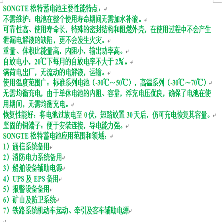 优异的放电性能:即便在低温环境下,松特蓄电池也能够保持良好的放电特性,确保在关键时刻提供稳定的电力供应。