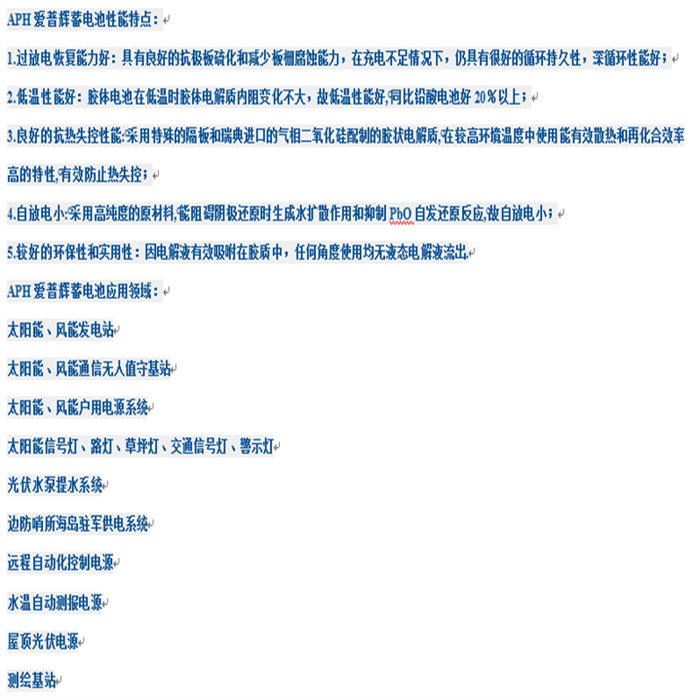 适用于环境广泛,在耐高温、过充电、深放电、长时间储存等方面表现; 胶体低维护阀控蓄电池技术是1957年由德国“阳光”发明;板栅结构,负极涂膏式,正极A400为涂膏式,而A600为管式,大大提 高活性物质的利用率,延长使用寿命;极柱密封结构主双层滑动密封,提高密封效果,无溢酸与漏液现象; 浮充电压低:单体为2.25(A400)-2.27(A600);散热效果好,没有温升,不存在电池干枯现象以及热失控现象; 电池贮存时间长,投入使用前不补充电长可达2年,仍有40%容量;应用范围包括电信、电力、UPS、应急动力、照明、铁路信号、海事设备等; 固体凝胶电解质,完全密封,无内部短路,无酸分层;的承受深放电及大电流放电能力,有过充及过放自我保护。
