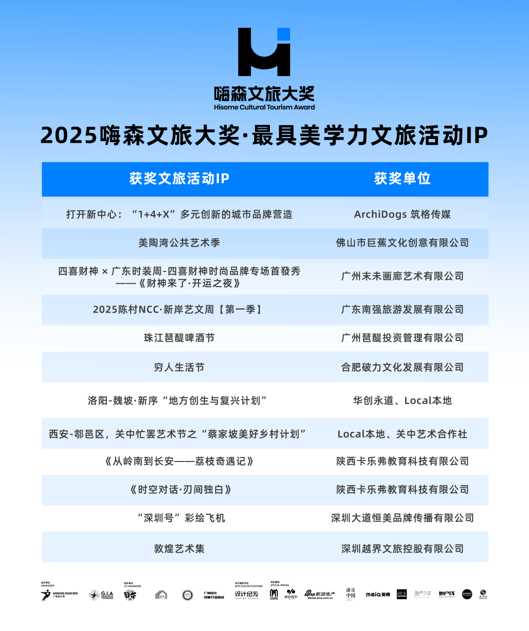嗨森文旅大奖(Hisome Cultural Tourism Award),是一项着眼于设计创新在未来乡村振兴和城市更新领域的思考和探索,面向全国文旅业主方、文旅运营机构、设计师个人及机构开放报名参评的评优活动,由亚洲瞩目、蜚声国际的设计产业盛会和设计产业资源整合运营平台广州设计周2023年发起。 嗨森文旅大奖旨在发掘和探讨文旅、商业、地产跨领域领先项目和发展趋势,邀请历届广州设计周 40 UNDER 40 当代设计杰出青年省区榜上榜青年**设计师及IAF锋建筑节历届锋100获得者担纲荐选官,向组委会推荐当地文旅项目、文旅活动IP、文旅运营机构进行报名参评。从多维度综合考量设计美学、文化内涵、体验创新、商业价值等关键要素,全面评选出在文旅行业各领域表现卓越的文旅项目、文旅活动IP、文旅运营机构,致力于以美学策源驱动文旅行业上下游的融合创新,提升高品质生活价值和赋能城市文旅发展。 2025嗨森文旅大奖自2025年4月发起征集以来, 受到了来自全国各地的文旅业主方、运营方以及设计机构的广泛关注与积极参评。经过组委会及荐选官的审慎甄选,依据评选规则,共有12个文旅活动IP凭借其在美学创意、文化内涵、参与体验、IP影响力等方面的卓越表现,获得“2025嗨森文旅大奖·最具美学力文旅活动IP”荣誉。 *排序不分先后,按获奖单位名称首字母排序 文旅活动IP 打开新中心:“1+4+X”多元创新的城市品牌营造 获奖单位 ArchiDogs 筑格传媒 作为城市品牌营造的路径之一,杭州城市重要新中心发展系列成果展以「打开新中心」为主题,通过一个简单、易传播的动作,呈现余杭区“历史沿革、自然环境、产业结构”三重叠合的城市新中心面貌。 在大多数城市展陈事件中,观展主体都围绕设计、研究、规划管理类的专业群体,而本次「打开新中心」的展陈策划与设计,试图以多元创新为出发点,探讨满足不同定位和广义社群的系列城市品牌事件——1+4+X,即1个完整展示城市建设成果的“专业”主展场,4个渗透在大众传播的“市民”分展场,以及由企业自发举办的多个延伸展览和活动。 「打开新中心」旨在为社会各界提供一次“打开”之旅,透过历史、当下与未来的多维视角,引领公众与****一同探索余杭,畅想杭州城市的独特魅力与未来愿景。 ■打开新中心:“1+4+X”多元创新的城市品牌营造 文活动IP 美陶湾公共艺术季 获奖单位 佛山市巨蕉文化创意有限公司 美陶湾公共艺术季是搭建一套作用于美陶湾的艺术赋能泛美学产业升级动能矩阵。打造一个独属于美陶湾的城市创意文化IP。通过一次公共艺术⻘年竞赛;一期街区艺术室内外展览;一场城市影响力沙龙联合50+****/研究学者、产业从业者/创业者有效组织起:10+国内知名建筑师/设计师/艺术机构、30+艺术创作者术家/艺术机构创意玩家一起打造公共艺术季。 ■美陶湾公共艺术季 文旅活动IP 四喜财神 × 广东时装周-四喜财神时尚品牌专场首發秀——《财神来了·开运之夜》 获奖单位 广州末未画廊艺术有限公司 《财神来了·开运之夜》是“2025广东时装周·春季”的开幕重磅活动,由原创IP“四喜财神 RICHPAPA”携手广东时装周组委会共同呈现。活动以“好运哲学”为核心概念,将传统财神文化与当代时尚艺术结合,通过服装走秀、艺术装置与互动舞台,构建出“好运登场”的开运氛围。四喜财神以标志性击掌动作为核心视觉,寓意“好运即刻启动”,现场设置财神击掌互动装置与快闪展陈,吸引超3000人次参与。活动打破“时尚 × 文化 × IP”的边界,成为广府春季时尚文化季的亮点事件。 ■《财神来了·开运之夜》 文旅活动IP 2025陈村NCC·新岸艺文周【第一季】 获奖单位 广东南强旅游发展有限公司 NCC·新岸艺文周,是一场面向全民开放的公共活动,内容涵盖了艺术装置展陈、艺文活动举办、美食&文创市集以及市民公益活动。这场“把艺术搬到公园里,将生活过成诗与远方”的城市美学活动,既是一场文化艺术盛宴,也是一次爱心公益活动,还是一次体验式的现场文旅招商,更是陈村深入践行“以水美城、以城聚才、以才兴城”战略,着力打造最年轻的青年创业乐业之城的一个实践缩影。 活动创新点:通过整合艺术家、艺术机构、教育机构、文艺协会等资源,搭建展演舞台、布置艺术装置、开展艺术体验,为群众搭建起便捷参与文化活动、享受文化生活、展示文艺才能的平台。 活动三天参与人数累积1.5w人次。 ■2025陈村NCC·新岸艺文周【第一季】 珠江琶醍啤酒节 获奖单位 广州琶醍投资管理有限公司 啤酒节的意义不止于“酒”,更在于生活,是对一座城市文化、活力、创新、时尚、气质的深度催化。珠江琶醍啤酒节至今已举办八届,即将迎来第九届。其开创性地将高端啤酒派对元素与音乐元素、美食元素跨界联动,将这种复合的属性有机碰撞,对广州文旅积极探索新业态、新场景、新模式,在为市民和游客提供优质服务的同时,不断深化啤酒节内涵意蕴和氛围营造。来自四面八方的宾客在每一次举杯中品味美好、传播啤酒文化,助力广州夜经济的发展。如今,已经成为展示魅力珠江、文化珠江、活力珠江的重要窗口,以酒为媒推动文旅产业转型跃升。作为“Young城Yeah市”夜间消费节、“海珠文旅奇妙季活动”之一,啤酒节充分发挥集聚优势,以节聚势、以会赋能、以酒为媒,持续助力释放消费潜力,为广州第三
