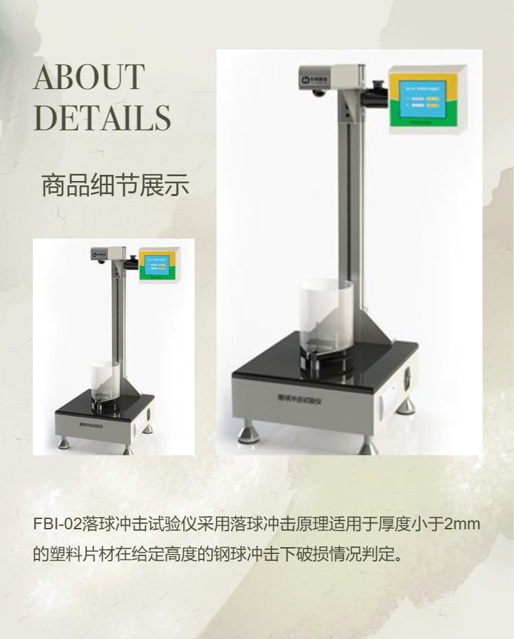 FBI-02配备了标准钢球落球系统,能**控制落球高度和位置,确保每一次冲击的稳定性和可靠性。钢球落球冲击试验仪通过落球撞击,测定材料的抗冲击强度,特别适用于对塑料薄膜及玻璃材质的脆性表现测试。仪器采用耐磨材质制成,确保长时间使用中的稳定性和准确性。