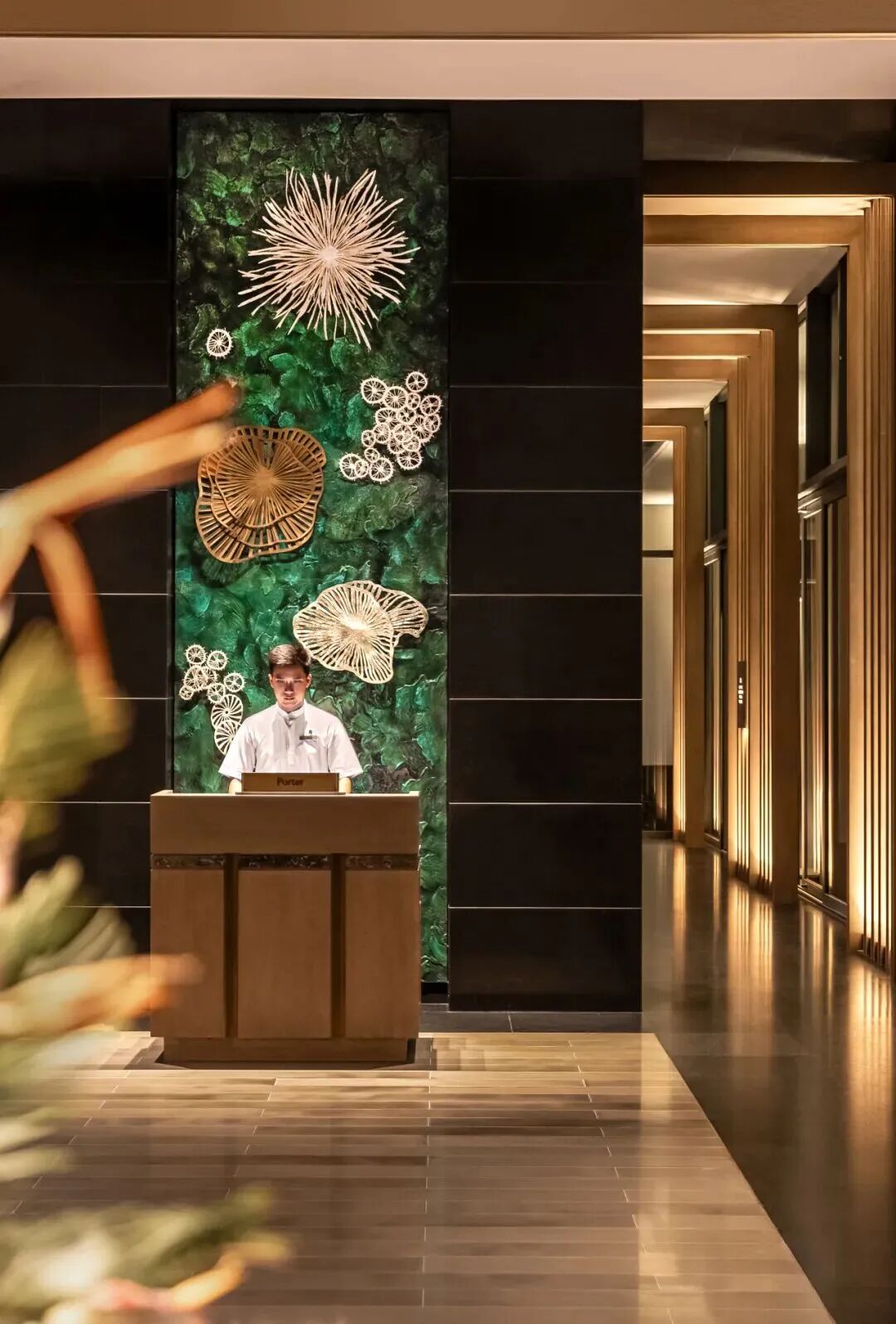 以在地为文本,艺术复刻时间的脉络。设计师捕捉渔民出海的场景,将富国岛独有的白色沙滩,碧蓝波光,律动撒网及温柔海浪邀入画框,以具仪式感的艺术叙事秩序,呈现大堂低调华丽,却满满的隆重接待空间体验。同时「旧木回收」的船型木刻材质于微部落笔,一段渔人的时代往事如映眼前。