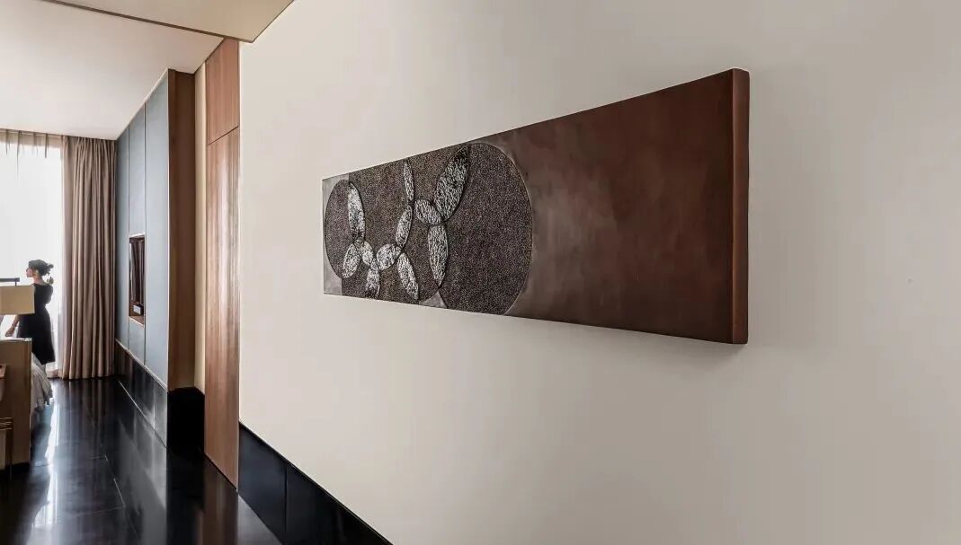 享誉全球的「越南富国岛黑胡椒」被纳入客房主要艺术创作启发,设计师选取当地的黑胡椒,经风干防腐处理,加入金箔蜡封,创作出一幅“琥珀胡椒”的装置艺术,向入住者讲述着富国岛原汁原味的特产胡椒与当代艺术结合的魅力。 同时盛产的「越南沉香木」,经手工雕刻纹理也氤氲出时间的沉香。现代东方雅情的装置艺术,为SPA的氛围呈现松弛。