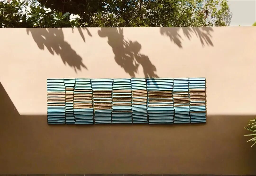艺术的氛围延伸到室外,户外泳池的「黄金海面陶瓷艺术装置」经多次的实验研发调制彩釉烧制而成,让艺术更经得起气候的侵蚀,将渔民出海捕鱼的日常定格成一帧不朽的风景画。