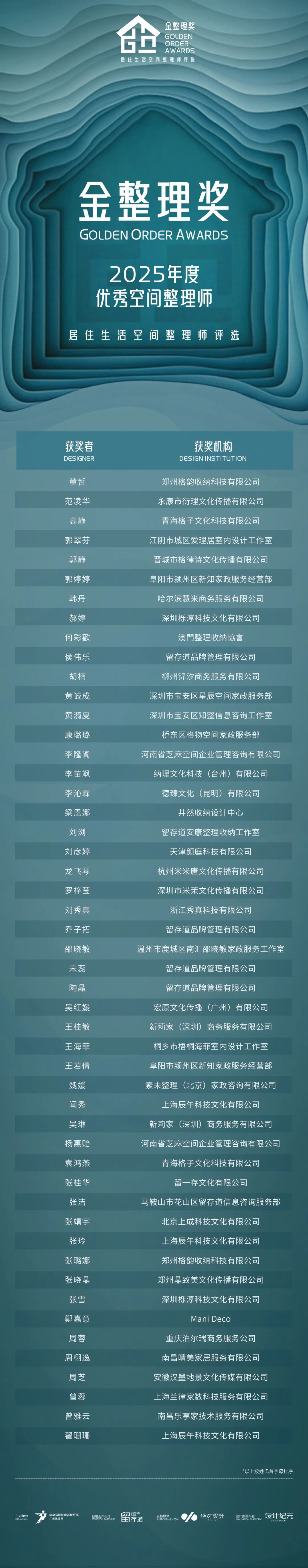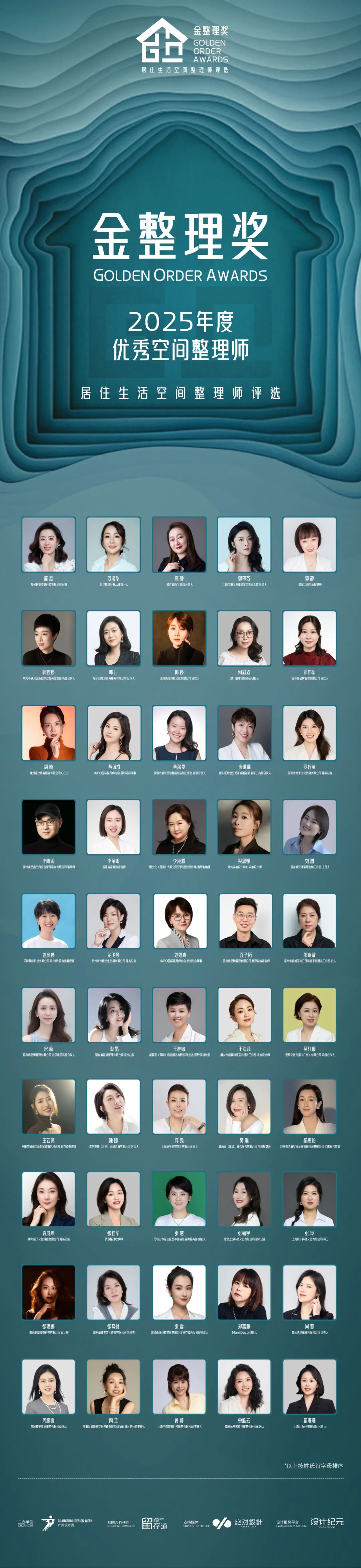 金整理奖-居住生活空间整理师评选」是中国首个聚焦空间整理领域的专业奖项体系。以空间转化率为标尺,以行为引导力为维度,以美学增值度为准则,系统性发掘那些通过收纳思维重构空间逻辑的整理师。 2025年,金整理奖携手留存道,发掘那些通过收纳思维重构空间逻辑的整理师,重新定义现代人理想居所,持续推动中国居住空间整理行业向更高标准发展。 经过严格的把控和遴选,组委会以空间转化率、行为引导力、美学增值度三大核心评审准则为锚点最终评选出了以下50位“2025年度**空间整理师”! 金整理奖-2025年度**空间整理师 获奖榜单揭晓 (*以下排名按名字首字母排序) 他们以收纳巧思焕新空间,诠释理想居住美学,再次向荣登 “2025 年度**空间整理师” 榜单的所有获奖者,致以最诚挚的祝贺! 2025金整理奖 居住生活空间整理师评选颁奖典礼 这不仅仅是一场关于“收纳技巧”的颁奖,更是一次关于“生活方式重塑”的思潮碰撞。而我们正在见证一个蜕变:整理师,不再只是帮你“收东西”的人,而是空间的算法师、美学的秩序家、生活的规划者。他们用“收纳思维”重构动线,用“行为引导”改变习惯,甚至通过整理,让房子增值,使得生活焕然一新。通过1场颁奖盛典,2场深度对话论坛、4场主旨演讲等环节,我们邀请你,一起走进「居住生活空间整理师」的世界。 从整理空间到整理生活 2025金整理奖-居住生活空间整理师评选颁奖典礼 我们不见不散! ⏰活动时间: 2025年12月7日 14:00-18:00 地点 : 广州海珠国际会展中心负一楼18号馆论坛区