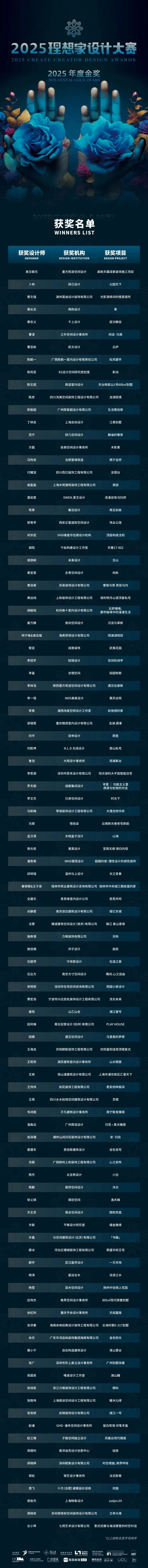 年度评审团他们从设计创新性、空间功能性、材料运用、可持续性等多个维度,对参赛作品进行了为期一个月的严格评审。每一件入选作品都经过层层筛选,确保其代表中国住宅设计的最高水准。 值得一提的是,本届大赛特别注重作品的落地性和实用性。"我们不仅要看设计的美学价值,更要考量其在实际生活中的应用效果"。 评审团代表指出,"这些获奖作品不仅具有艺术价值,更能为居住者带来实实在在的生活品质提升。" 在2025年度的评选中,组委会及评审团对全国 6953 参评作品进行了为期一个月的严格评审,最终100位兼具领先设计思维与创新精神的**设计师脱颖而出,荣登“理想家设计大赛2025年度金奖榜单”。 理想家设计大赛2025年度金奖 榜单揭晓 “我们通过这些**的作品,激励更多设计师投身于理想家居的创造,共同推动中国人居环境的爱山与提提升"。随着榜单的发布,在2025理想家设计大赛正式进入高潮阶段。 12月5-8日 让我们相约广州 共同见证中国住宅设计的**成就 展望未来理想家的无限可能