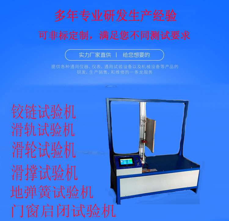 门窗开合性能试验机则是模拟实际使用场景,评估铰链和整体门窗结构在日常使用中可能遇到的各种应力和磨损情况,帮助用户优化设计方案,提高产品寿命与安全保障。