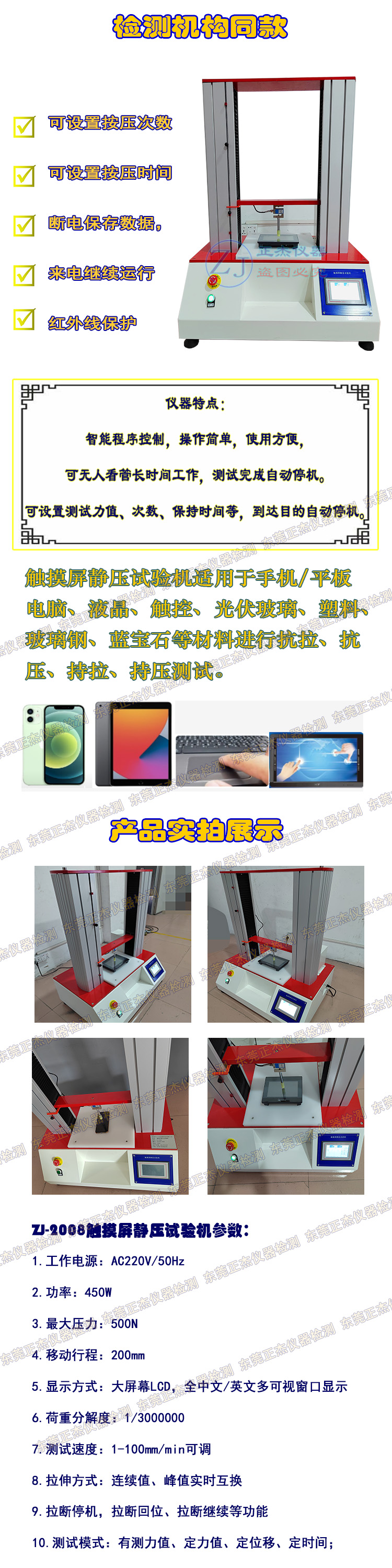 正杰仪器的触控屏硅胶按压试验机采用高精度伺服电机驱动,与柔性硅胶按压头结合使用,能够精准还原用户实际按压力度和频率。设备搭载微电脑控制系统,具备程序化设置按压次数、压力大小和速度等参数,实现自动化与可重复性的测试过程。