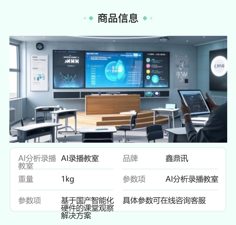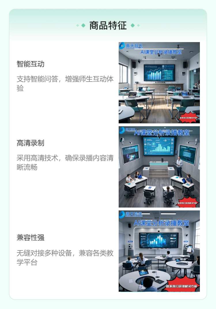 - 一站式教学场景覆盖,包含智慧教室、督导教室、录播教室、AI分析教室、微格教室多重功能。