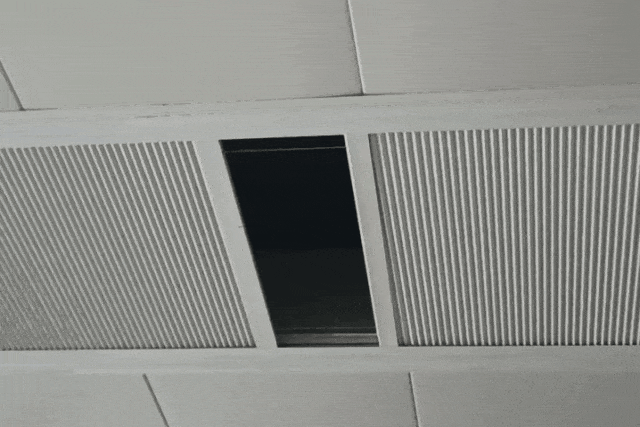 根据医科达加速器设备的需求,工字梁下方吊顶需留出滑车通道,并做活动吊顶和龙骨,不可影响滑车、吊葫芦的运行。为了让医护人员与厂家技术人员,能够更方便快捷的进行加速器设备的日常维护和检修,嘉美伦创新使用可电动开合的顶部设计,通过控制器或遥控器来控制顶部吊顶的开启和关闭。