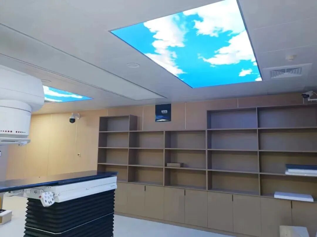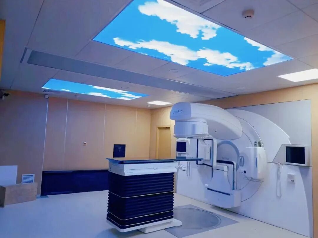 同样是为了能够在视觉上给加速器顶部释放出更多空间,嵌入式灯带的间接明设计与软膜灯箱的照明设计各有所长。江苏省和黑龙江省的放疗空间,嘉美伦综合客户需求和实际场地采取了别样的顶部设计。