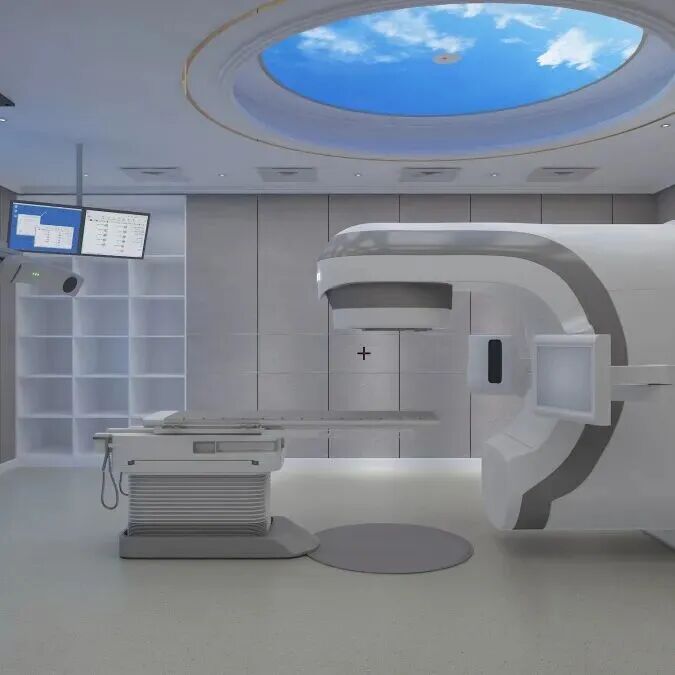 软膜天花不但能够提供充足又均匀的光线,还具有独特的防尘抗菌的功能,在放疗机房的装修中深受青睐。嘉美伦的很多放疗机房项目均采用铝扣板吊顶,中间区域采用软膜天花灯箱,圆形的软膜灯箱简约美观,中和了瓦里安Halcyon加速器棱角所带来的冰冷坚硬感,搭配上墙面与地面不同的色彩和材质,营造出更为温馨治愈的氛围。