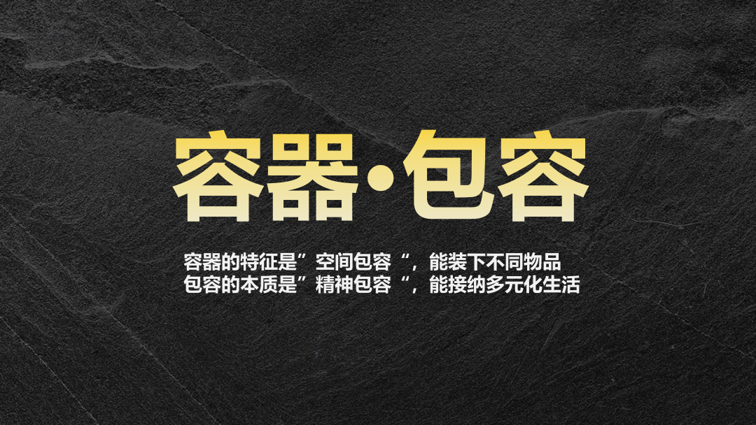 为什么叫“容器·包容”?本次演讲的主题方向是“创造品质美好生活的空间与体验”,我从中捕捉到两个关键词:空间与体验。空间,我将其理解为“容器”——它能够容纳物品,更可包容多样的生活场景与状态。而体验,我认为可分为两个维度:一是身体的感知,二是精神的感受。今天我更想聚焦于后者,即精神层面的体验。精神体验的本质是包容,它接纳多元、承载情感,让空间超越物理功能,成为人与生活、与内心对话的媒介。