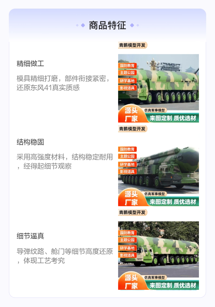 军事模型作为一种独特的艺术和教育载体,近年来在各类展览、教育和影视作品中越来越受到重视。河南青鹏模型开发有限公司专注于提供高质量的仿真导弹车模型,不仅满足爱好者的收藏需求,也成为研学教育和影视展览的重要道具。这些模型不仅在外观上真实再现了各类导弹车的细节,更在功能和教学应用中展现出极大的价值。