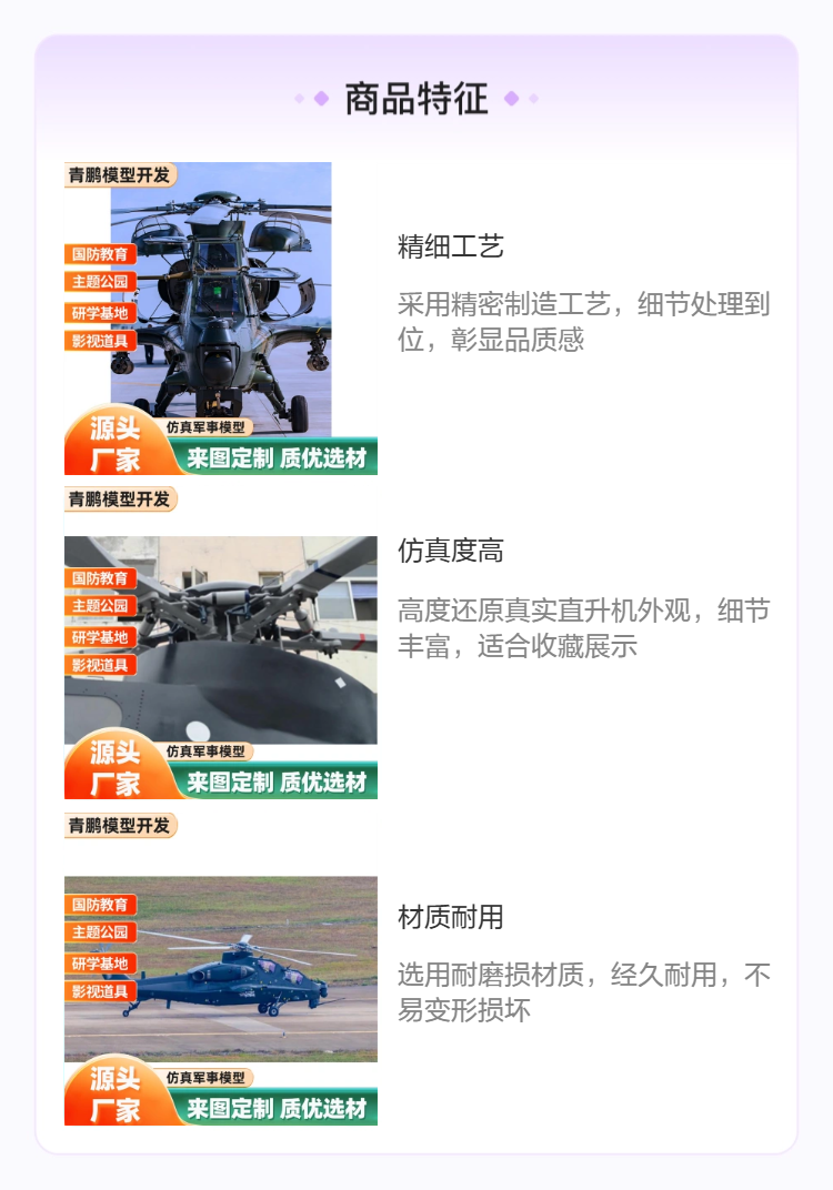 青鹏定制直升机模型无疑是军事爱好者与模型收藏者不可错过的精品,凭借其高标准的制作工艺与精美的外观设计,让这一产品成为市场上的亮点选择。如果您也渴望拥有一款既美观又具收藏价值的直升机模型,不妨考虑选择青鹏定制直升机模型,定会为您的收藏增添一抹亮色。