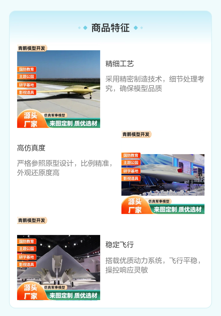 此外,青鹏的模型还适用于展览、影视拍摄及科研项目,广大用户可以在各个场合中欢乐分享。采用金属材料制作的模型不仅体积庞大,耐用性强,且在视觉效果上更为抢眼,流线型设计与战斗机和无人机的本质高度契合,极具观赏性。对于搭建军事模型场景或进行实战模拟,青鹏模型是非常理想的选择。