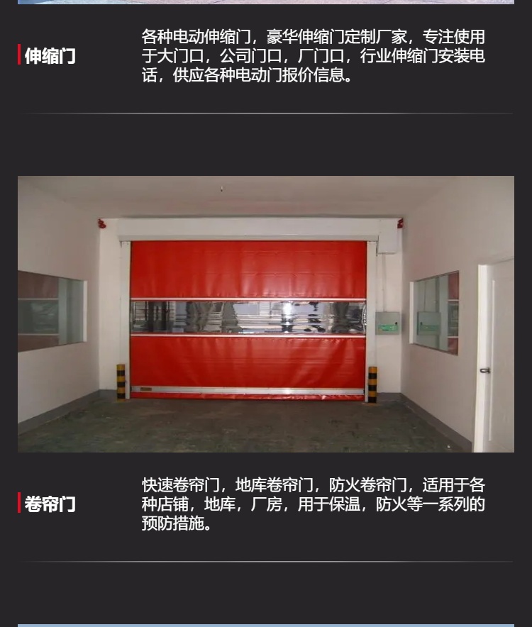 - 侧边密封:门柱两侧配备双层毛刷密封系统,与门帘形成柔性密闭接触,即便在强风环境下也能保持严密。