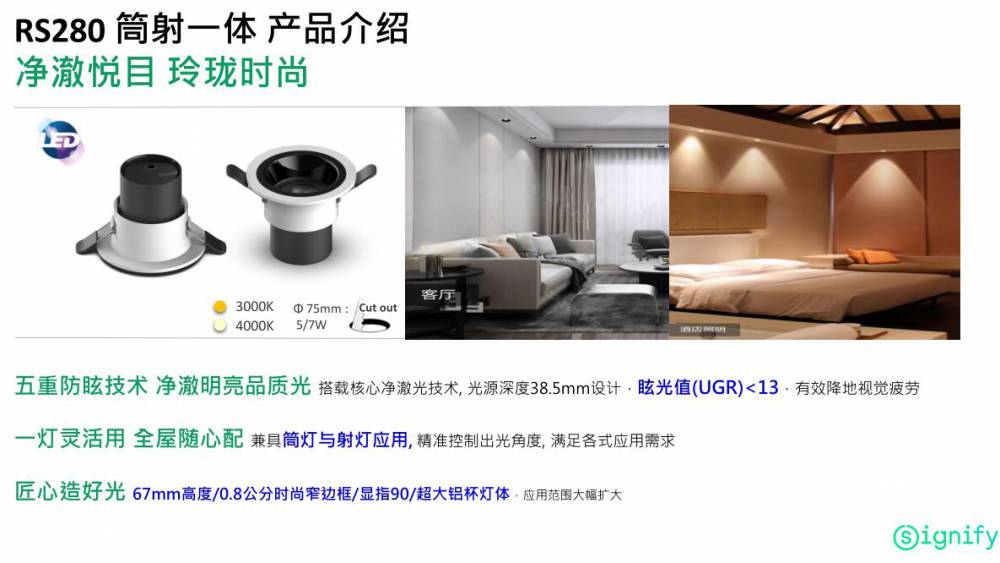 飞利浦LED筒灯RS280具有67mm紧凑形设计,适用于低吊顶天花等各种室内装修环境