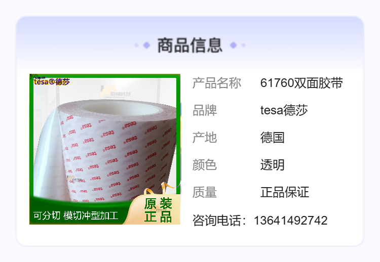 在电子装配、智能穿戴设备组装及车载显示模组生产中,视窗区域的精密粘接长期面临双重挑战:既要实现光学级透明无痕,又需承受回流焊、热压合等高温制程考验。TESA61760双面胶带正是为破解这一矛盾而生——它并非普通PET基材胶带的简单升级,而是德莎(tesa)针对高可靠性粘接场景构建的系统性解决方案。其核心价值不在于单一参数的堆砌,而在于胶层化学设计、基材热机械性能与涂布工艺三者的深度耦合。深圳市楷铭科技有限公司作为华南地区专注功能性胶粘材料应用服务的供应商,已将TESA61760双面胶带纳入高端模切加工体系,使终端客户得以跳过材料选型试错周期,直接获得适配产线节拍的即用型组件。