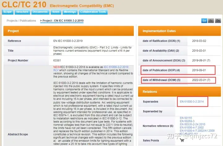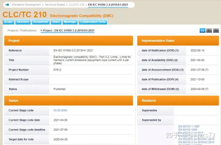 首先点击EN IEC 61000-3-2:2019看下这个标准的实施情况,在EN IEC 61000-3-2:2019/A1:2021正式实施前,这个标准就是最新的标准,也是目前做的最多的标准。