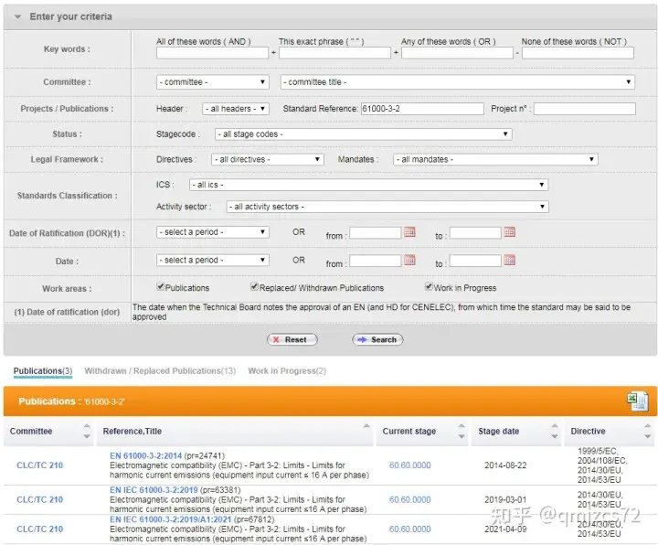 上图中我查询的是标准61000-3-2,这是电磁兼容里面的谐波测试标准,是非常常见的一个测试标准,一般可以在EMC证书的标准栏中看到它(低压产品不做这个标准)。