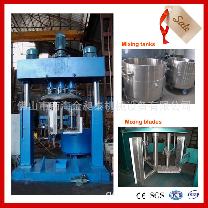 三轴强力分散机是一种无死点高低速结合、强力分散混合搅拌设备,釜内有三种不同形式的搅拌器,其中一个搅拌器慢速刮壁旋转,其余两面搅拌装置又以不同的转速绕自身轴线高速运转,使物料在釜内作复杂的运动,受到强烈的剪切和搓合。设备内山形刮壁刀绕釜体轴线转动,将粘在壁上和底部的原料刮出参与混合,使其效果更为理想。设备密封性好,可抽真空,具有良好的排气除泡效果。设备釜盖可液压升降。釜体可自由移动,操作十分方便。搅拌器的形式,根据物料要求可为多层浆叶式、框式、蝴蝶式、外轮式等。