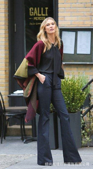 撞色羊绒披巾+黑色领带丝质衬衫+复古深蓝色喇叭裤