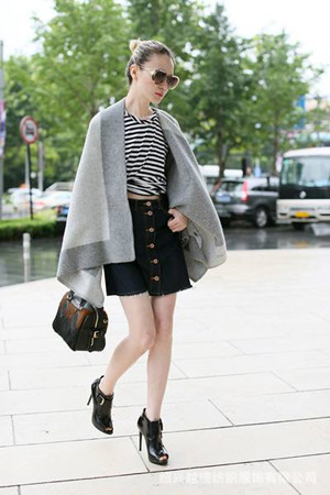 灰色羊绒披巾+条纹针织打底衫+黑色牛仔磨须短裙+鱼嘴细高跟踝靴+波士顿包+棕色墨镜