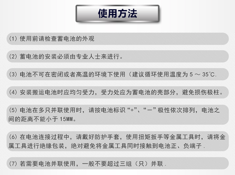 4、寿命长(设计寿命3~6年)经济性好:电池板栅采用耐腐蚀性好的特种铅钙合金,同时采用特殊隔板能保住电解液,再同时用强力压紧正板活性物质,防止脱落,所以是一种寿命长、经济的电池。