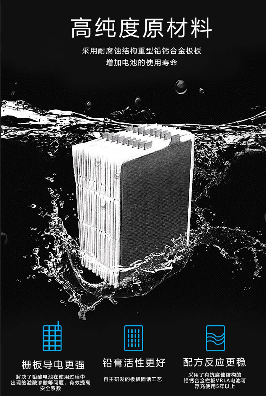 1、极板:正负极板由氧化铅涂于铅钙合金板栅制成,可快速充电。