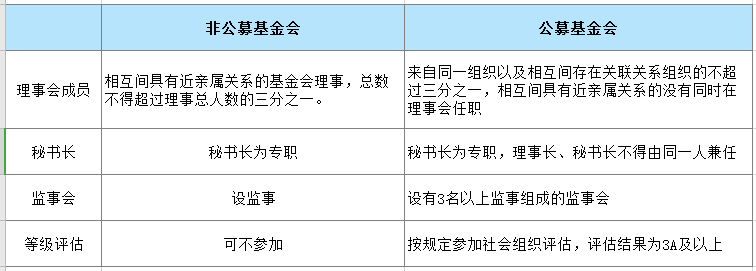 非公募基金会与公募基金会在内部治理结构、法定的理事会成员及利害关系人人数、理事长秘书长兼任情况、监事会组成情况、等级评估情况都有所不同。